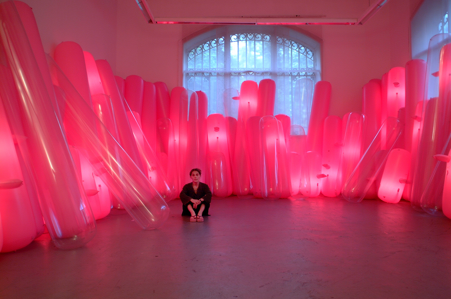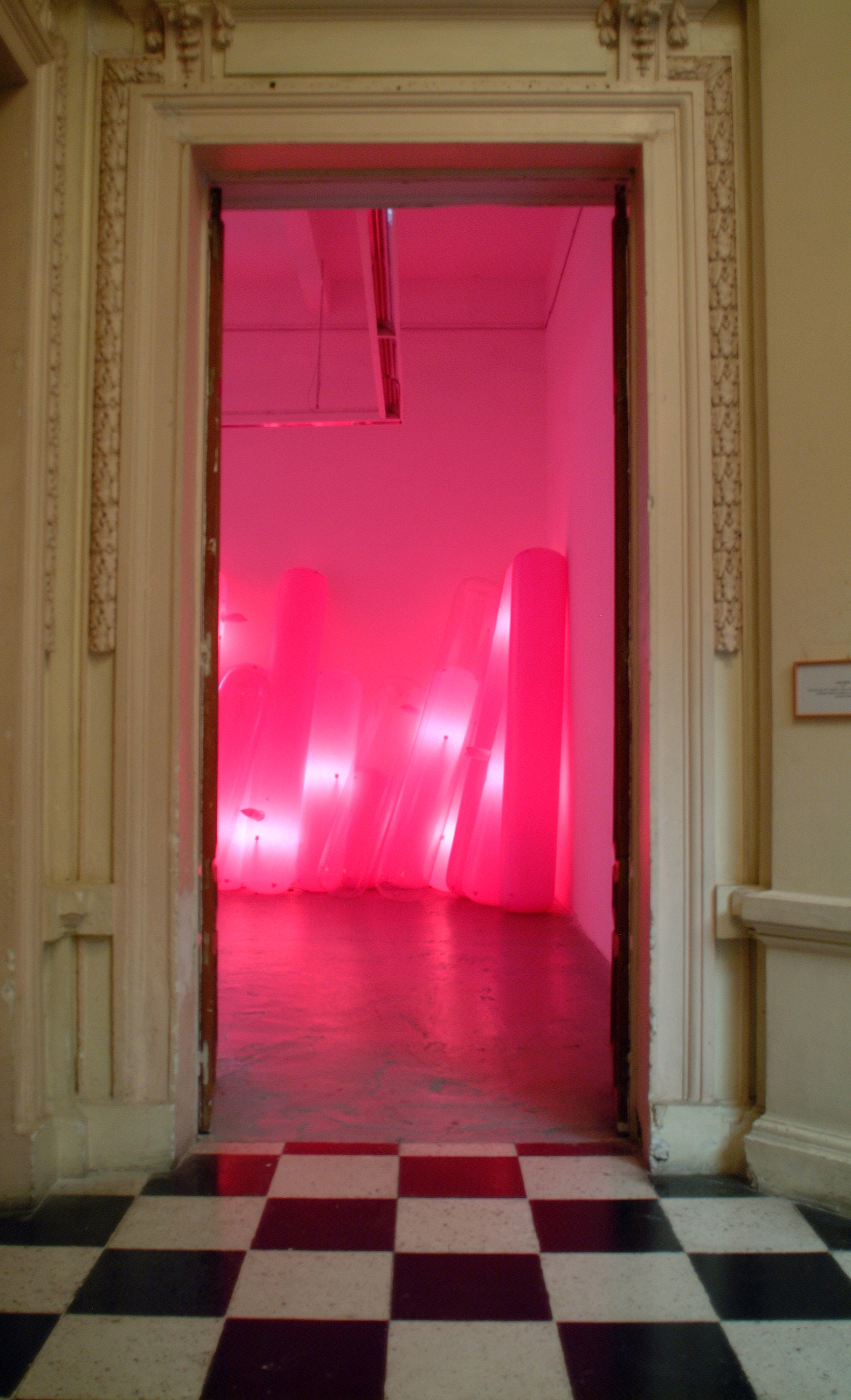 Acopio. 100 cilindros inflables de plástico rosado y transparente, luz interior en 50 de ellos. Alturas: 1.00 m / 1.50 m / 2.00 m. Diámetro: 0.50 m. Parte de exposición Frutos del País. Museo de Arte Contemporáneo (MAC), Santiago, Chile. 2002.