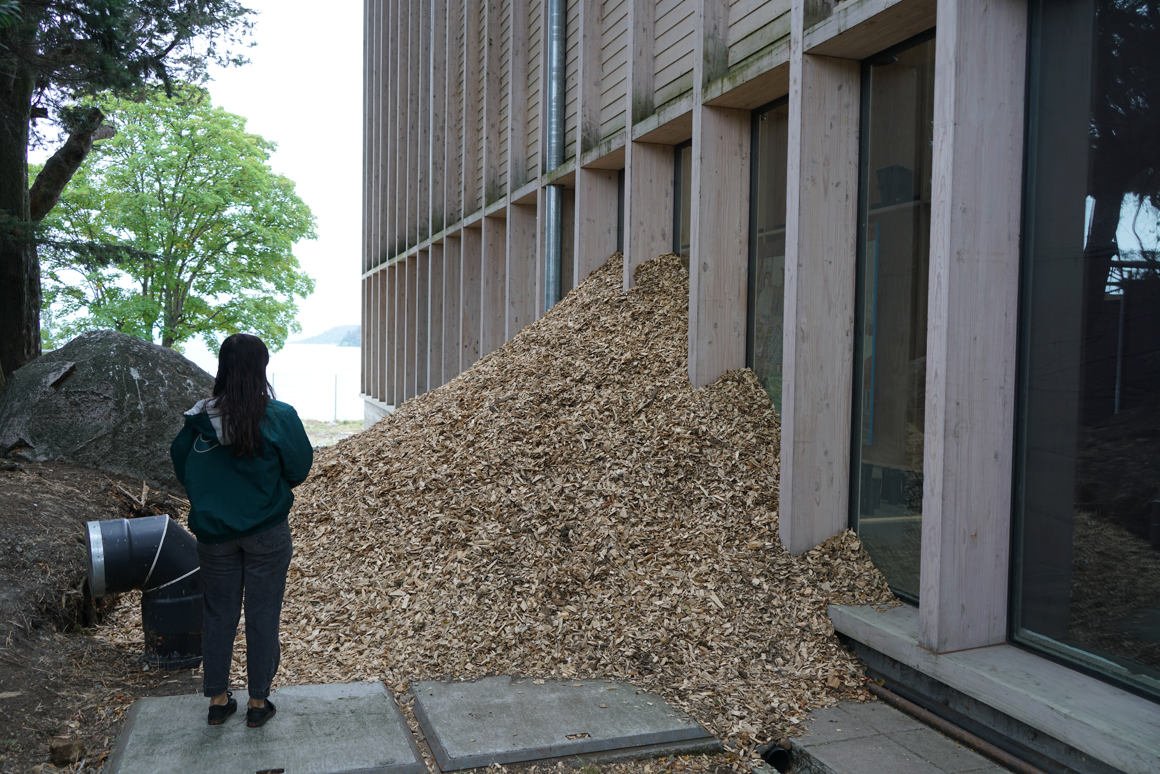Esta ruma de chips se instala fuera de la galería, apoyándose contra su superficie de vidrio. Desde el interior, el espectador observa cómo el residuo vegetal adquiere una nueva presencia: ya no es árbol ni rama, sino un material de