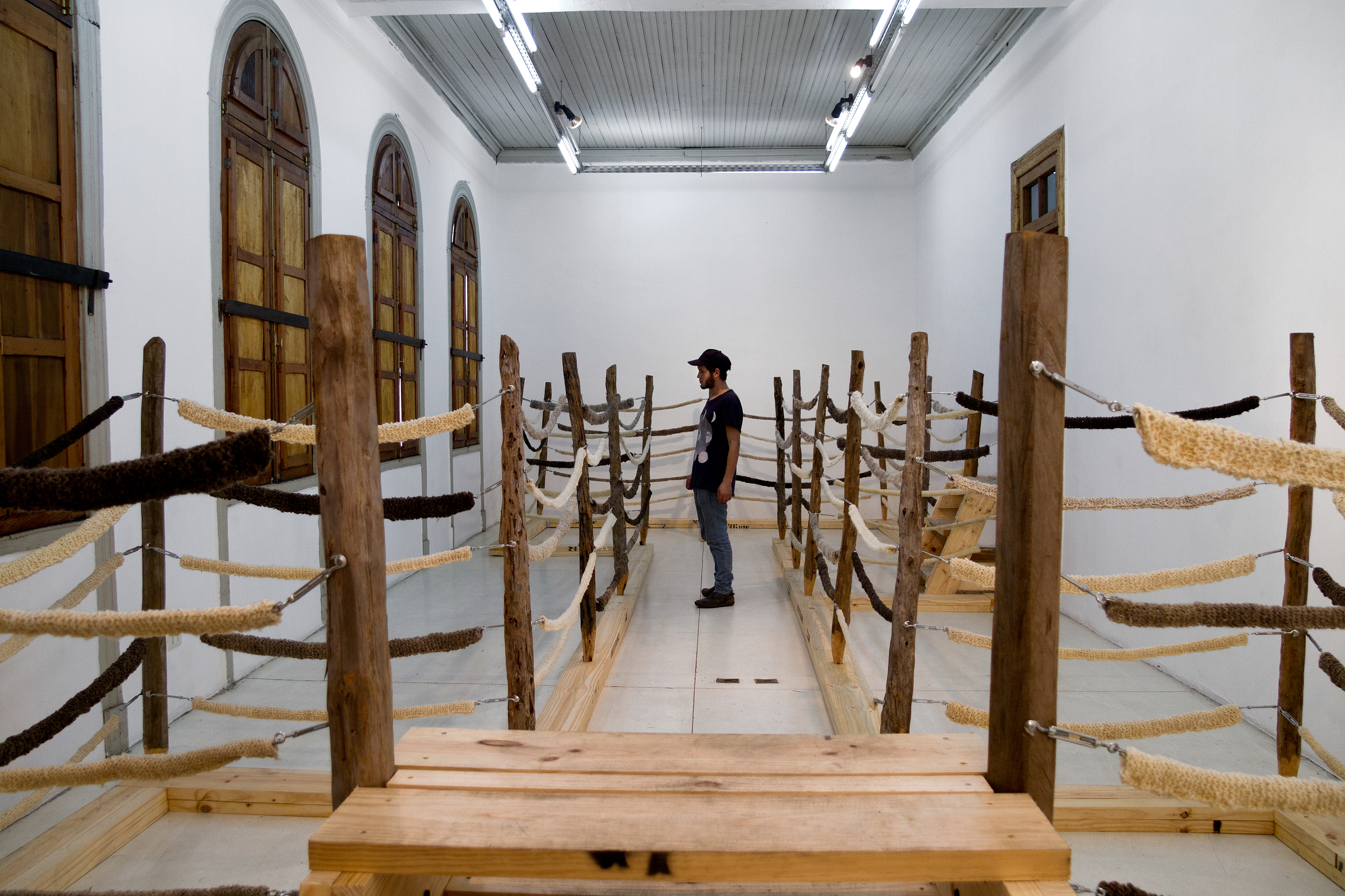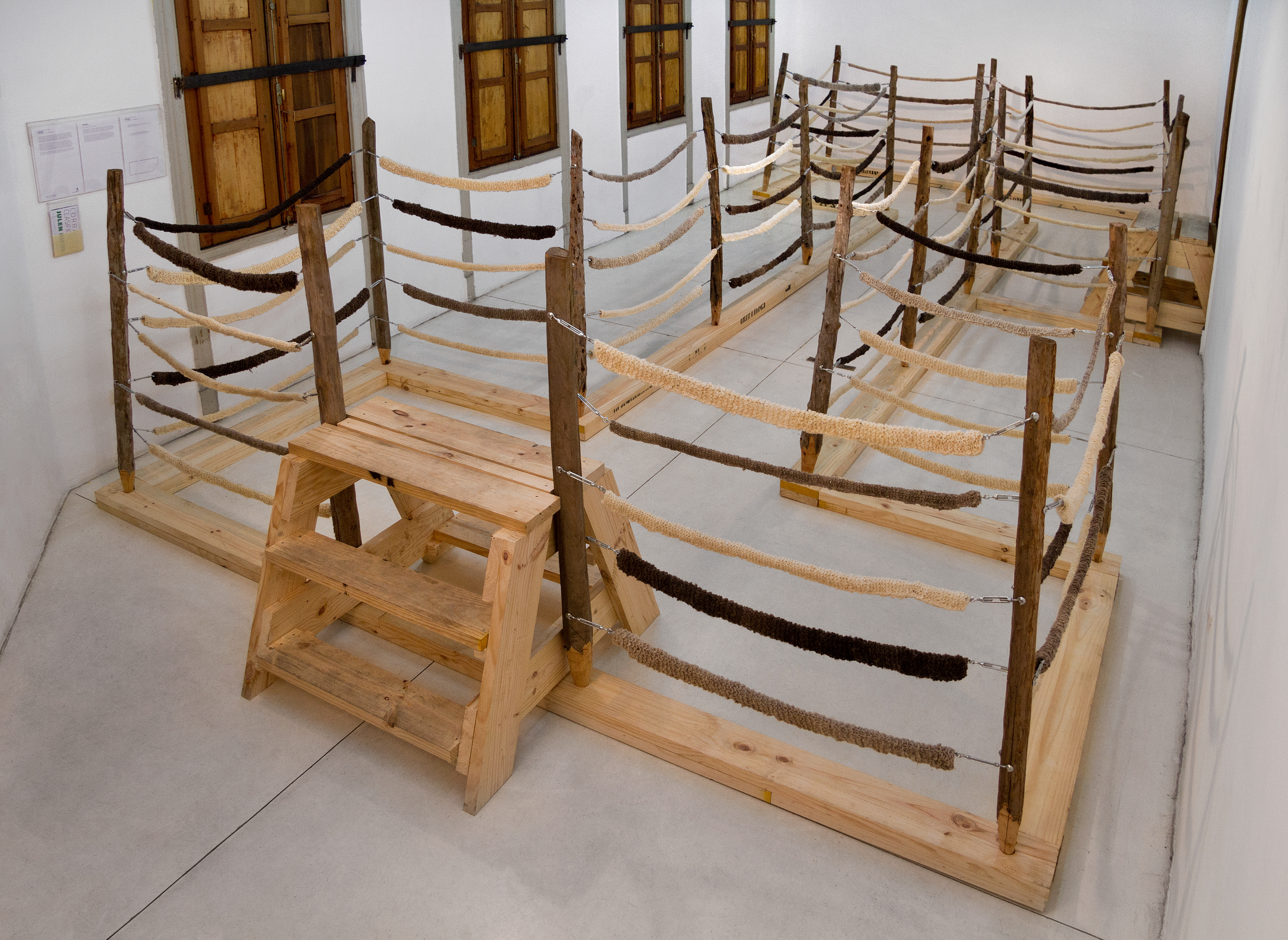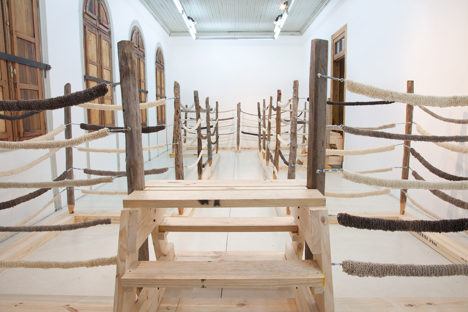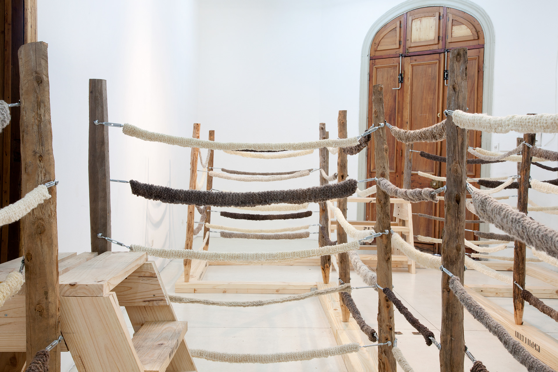 Corral de clasificación. 24 estacas de ciprés de las Guaitecas con plan de manejo, 175 metros de alambre de púa. 30 vigas estructurales de 2 x 8 pulgadas y 12 kilos de lana natural hilada con huso y rueca (con variación en el grosor del hilado). 9 metros de largo x 4 metros de ancho. 36 m². Parte del proyecto Materia Animal. Galería Die Ecke, Santiago, Chile. 2014.