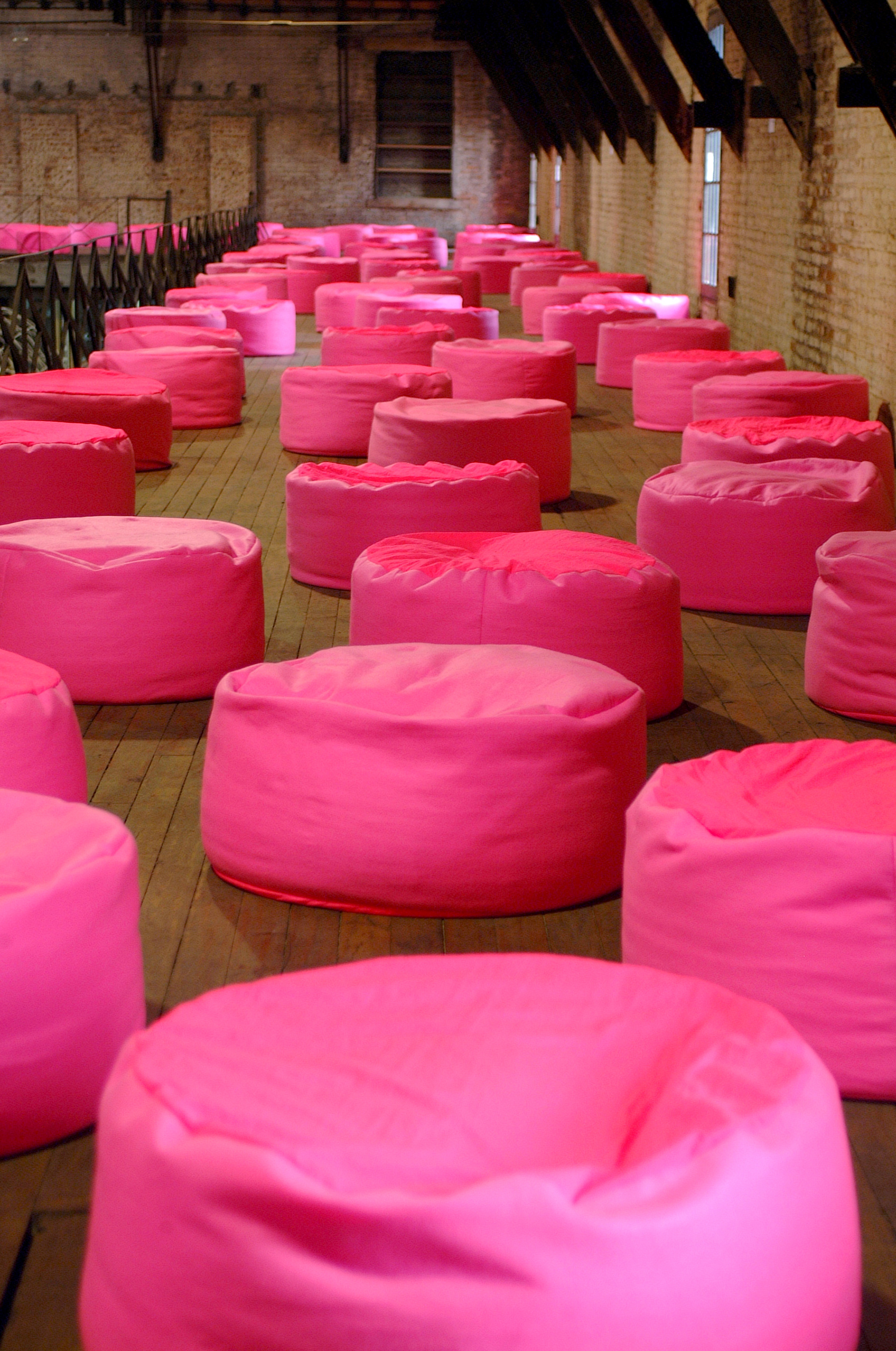 Floración. fieltro rosado, termapol perla. 100 volúmenes de 90 cm de diámetro x 45 cm de alto. 275 m². Parte de la exposición colectiva Con Poner. Centro Cultural Matucana 100, Santiago, Chile. 2003.