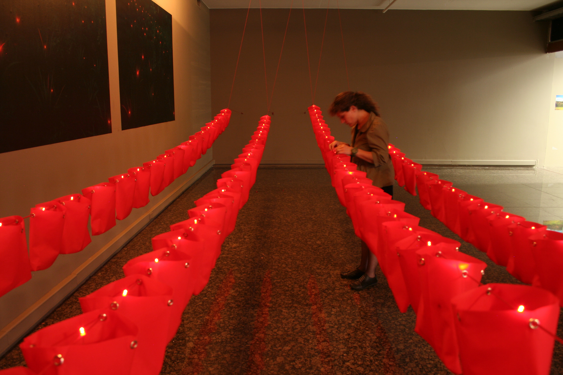 Luciérnagas de Sábila. 110 plantas de sábila intervenidas con 60 circuitos lumínicos. Circuitos eléctricos, diodos LED, interruptores, pilas alcalinas. 1.200 m² intervenidos. San Vicente, Finca Libertad, Medellín, Colombia. Participantes: 30 mujeres yerbateras. 2011.