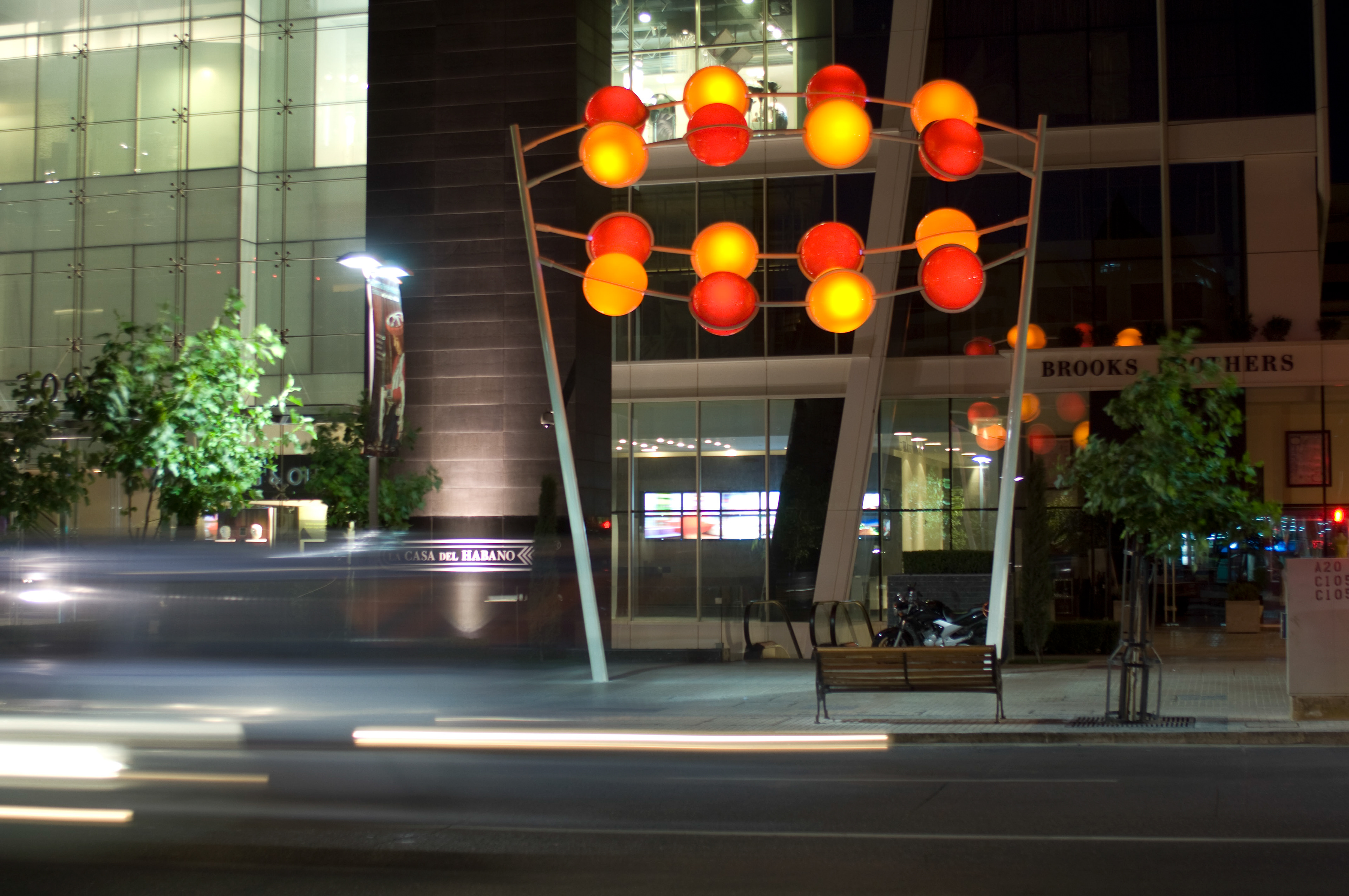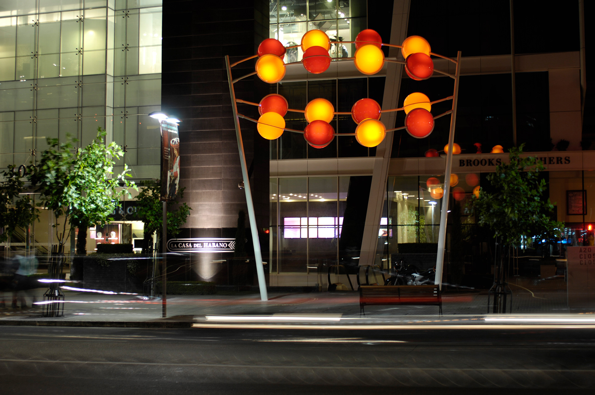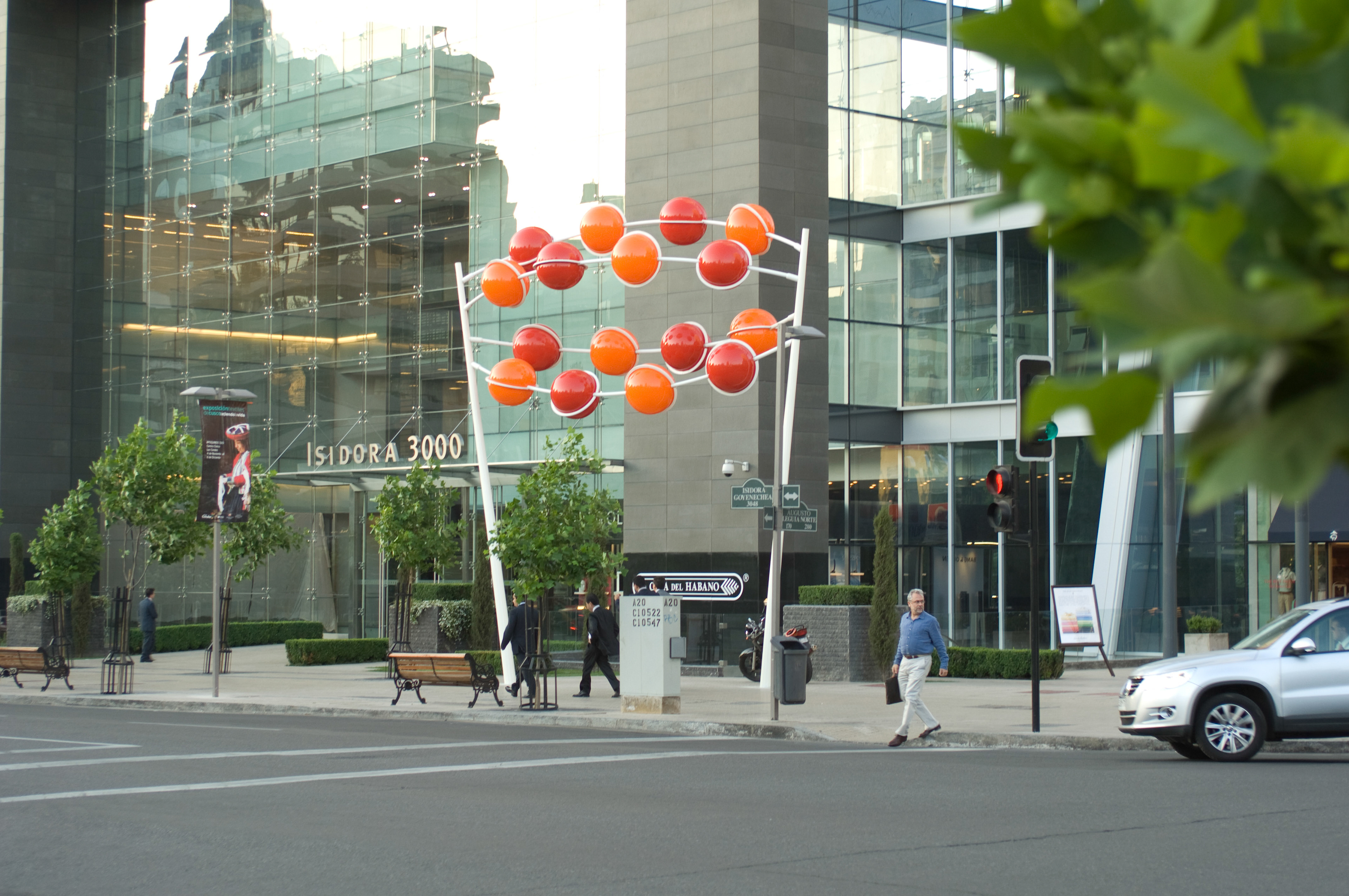 Quarks, estructura de acero pintada, 16 esferas de acrílico (8 mm), circuitos LED. 7 m de alto x 6 m de largo x 3 m de ancho. Obra pública permanente, Isidora Goyenechea 3000, Las Condes, Santiago, Chile. 2009.