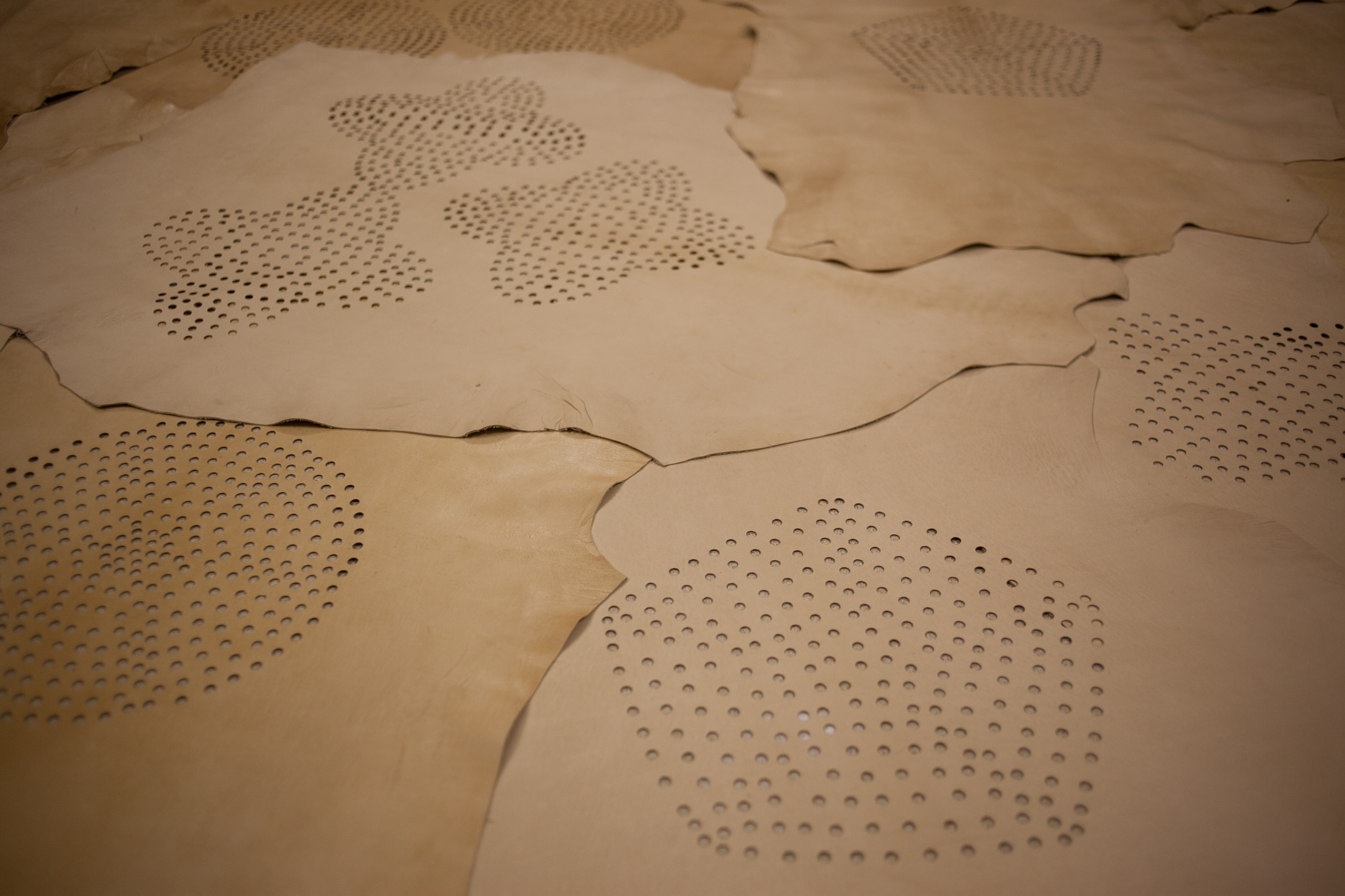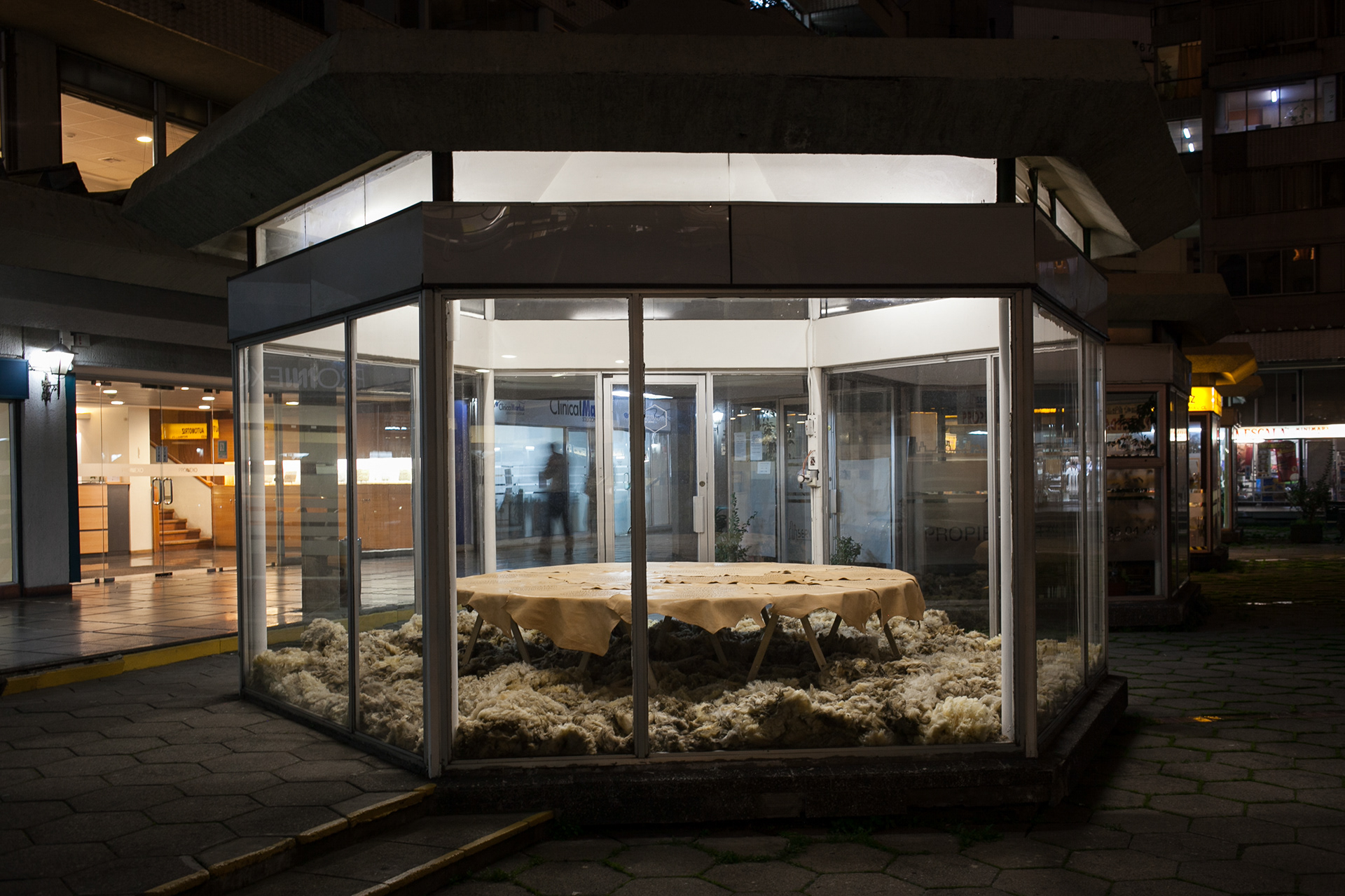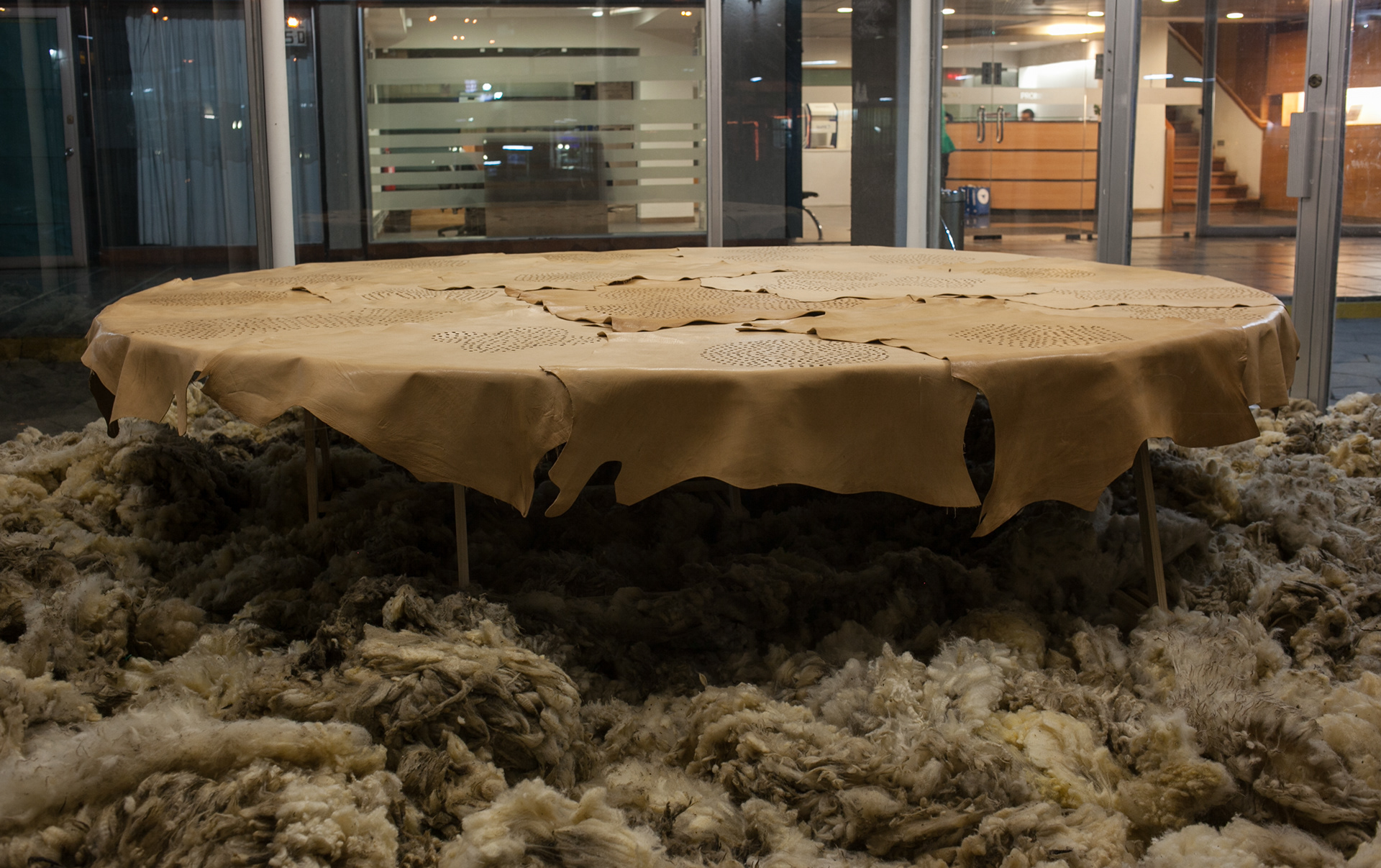 Tuson. Lana cruda y cuero de oveja, 25 m². Parte de Materia Animal, Galería Tajamar, Santiago, Chile. 2013.